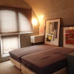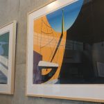 家に入ると緩やかに湾曲した壁面が目に付く。そこに今回は磯崎さんが世界各地で設計した建物の版画や絵が飾られている。絵が掛けられるようにと壁には収納できる留め金がついている。