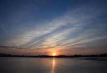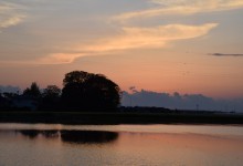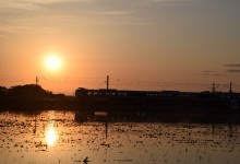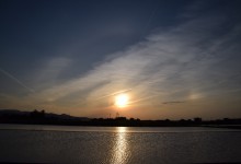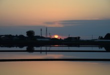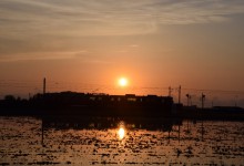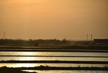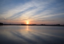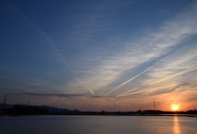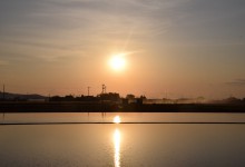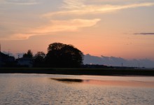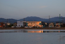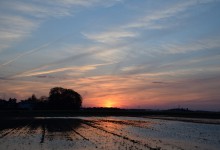 田んぼは早々と苗が植えられたところ、水が入れられたばかりでトラクターで下の土を耕しているところ、濁りも収まり水鏡のような穏やかな水面が広がることろ、まだら模様に広がる。稲が伸びて水が抜かれるまで、晴れた日は陽光をきらめかせ、雲を浮かべ、山の稜線を映し、夕方にはオレンジ色の夕日を映し出し、日没後も空の黄昏を受け止める。