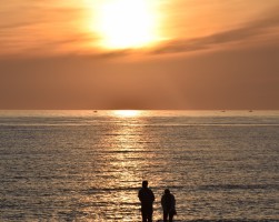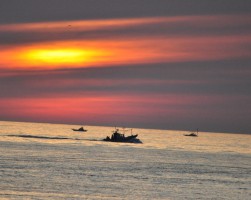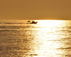 ビーチに着いたときはまだ明るい夕日は少しずつオレンジに変わってくる。沖には漁をしているのだろう小型船が同じ場所にいる。ただ水平線の上には薄い雲があるようで最後まで夕日は見えないかもしれない。