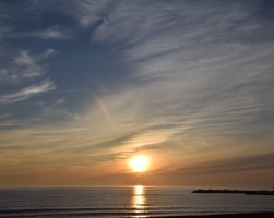 久しぶりに海の夕日を見たいと思い夏至翌日の6月22日、福井県坂井市三国町のサンセットビーチへ撮りに行った。午前中から晴れてはいるが、部分的な暈が見えたり、環水平アークが出たりとこれから天気が悪くなることが多い現象が現れる空模様。最後まで夕日が見えるかどうかわからずちょっと心配はあったが、午後6時過ぎでも少し雲がかかっているものの夕日は見えたので海に向かった。