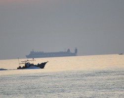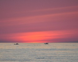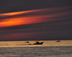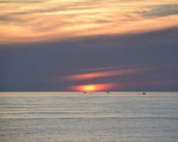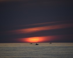 日没が近づく19時過ぎ、水平線の近くが部分的に赤く色づく。夕日を覆う雲が薄く夕日が透けて見える。漁船も重なって少しいい雰囲気だ。完全に海に沈むまで夕日を雲の薄いベールを通して見ることができた。