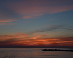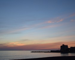 18時20分サンセットビーチに到着。まだ日は傾ききっておらず日没までには時間がある。広い海岸のあちこちで夕日を見ている人がいる。多分北海道の苫小牧発敦賀行きのフェリーだろう、大きな船影が水平線を左に進む。フェリーはほぼ定時に通るのだが、遅い日没とはシンクロしない。