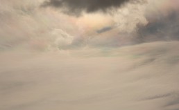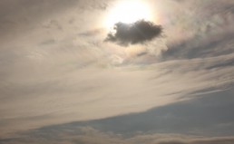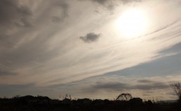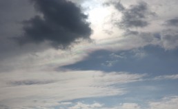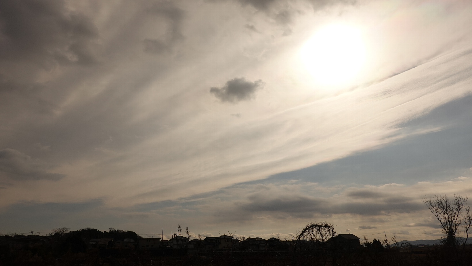 薄い雲が広がり、太陽の光を受けて彩雲が広がった。古来から吉兆といわれる彩雲。20分ほど見えた。午後にはすこし大きめのうろこ雲も広がった。天気は下り坂で夕日は見えなかった。