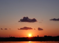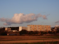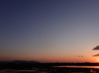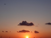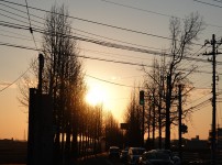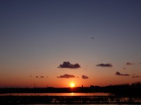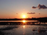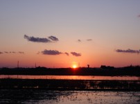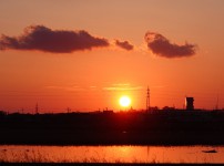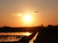 夕焼けがきれいそうだったので田んぼへでかけた。所々に水を少し張った水田があり夕日を反射する。太陽が茜色に変わっていくと雲もオレンジに染まり、ときどき上空を飛行機が通っていった。春分が近づき夕日の沈む方向は真西に近づき、遠くの建物が強い夕日を受けて輝いていた。