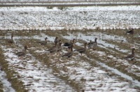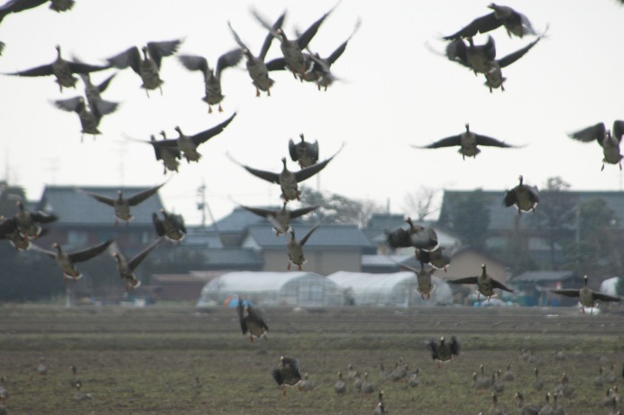 2/11 わずかに雪の降ったあわら市上番の水田で 大群がいくつもの田に分かれて食事していた
