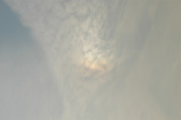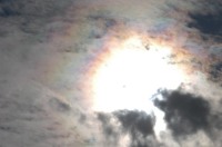 | 幻日 アーク 11/20午後3時頃 暈の両端に幻日が見えた。さらに暈の上にタンジェントアーク、その上に環天頂アーク。 |
