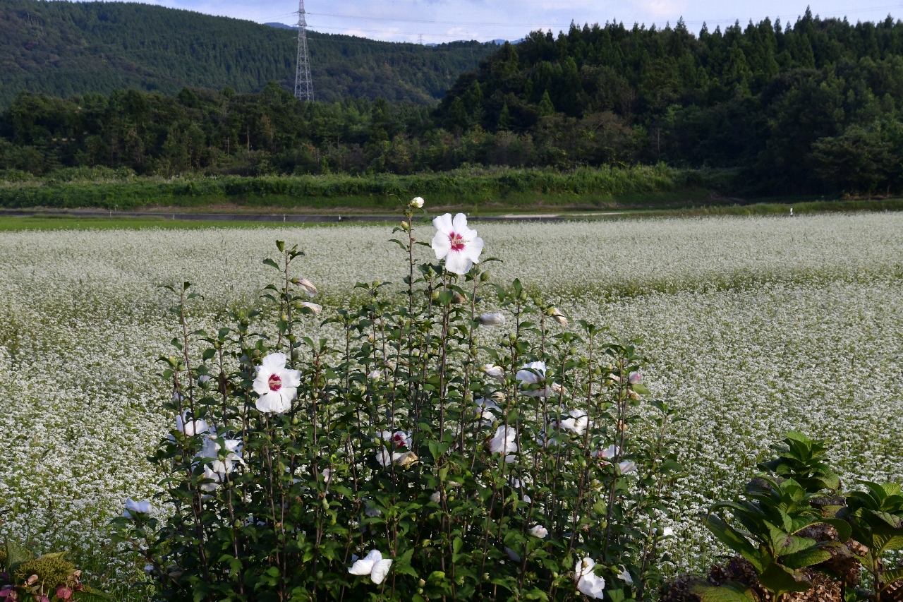 午後はプールへ。帰りはソバ畑へ寄り道。北陸線の線路が通り特急がやってきた。夕暮れの空には小さな幻日も見えた。