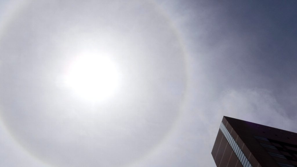 病院はかなり空いている。事前検査も含めてこれまでだったら1時間程度かかるのが30分からず終わった。玄関を出たら丸い日暈がくっきりとかかっていた。全体を収める広角のカメラを持っていたなかったので、バッグの中のコンパクトカメラでとりあえず撮って駐車場に向かい車を出した。近くのコンビニの大きな駐車場でもう一度撮影した。