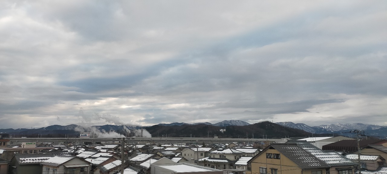 市役所の窓からは明るくなった空に製紙会社の煙突から水蒸気の多い煙が朝の冷え込みで白く立ち上がっているのが見えた。新幹線の線路や駅舎の工事も進んでいる。