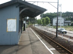 無人駅でホームに張り紙。臨時バス停からは100メートル近く離れている。