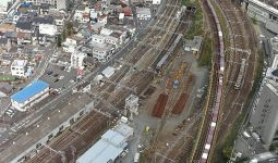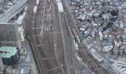 JRゲートタワーなどの高層ビルの下にある名古屋駅のホームとホームに向かう車両が見える。東海道新幹線、その関西本線、東海道本線、中央本線と17番線までホームがあり、次々と米原、岐阜方面から電車がやってくる。