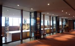 シャトルバスはホテルからいうと裏口に到着する。1階の広いスペースを奥に進みビルの反対側がパークハイアットホテルの入り口。2階から39階のロビー階に進む。エレベータを降りてオープンな雰囲気のレストランを通り本棚の前を通ってチェックインする。