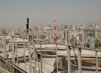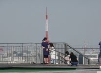 52階の展望台で500円のチケットを買い、エレベーターで54階のスカイデッキ入り口に向かう。屋上はカメラ、スマホ以外は持ち込み禁止で手荷物はロッカーに預けて上がる。エレベータを降りるとそこは六本木ヒルズの機械室。金網越しに空調などの機器が見えるゾーンを進み鉄製の階段をのぼると空が見え、一気に視界が広がる。ヘリコプターが着陸できる大きなマークや、電波を発信したり受けるアンテナが並びまさに屋上だ。鉄柵が周囲に並び外側には行けないようになっている。警備員も何人か立っていて、間違えてビルの端っこにいかないようにしている。